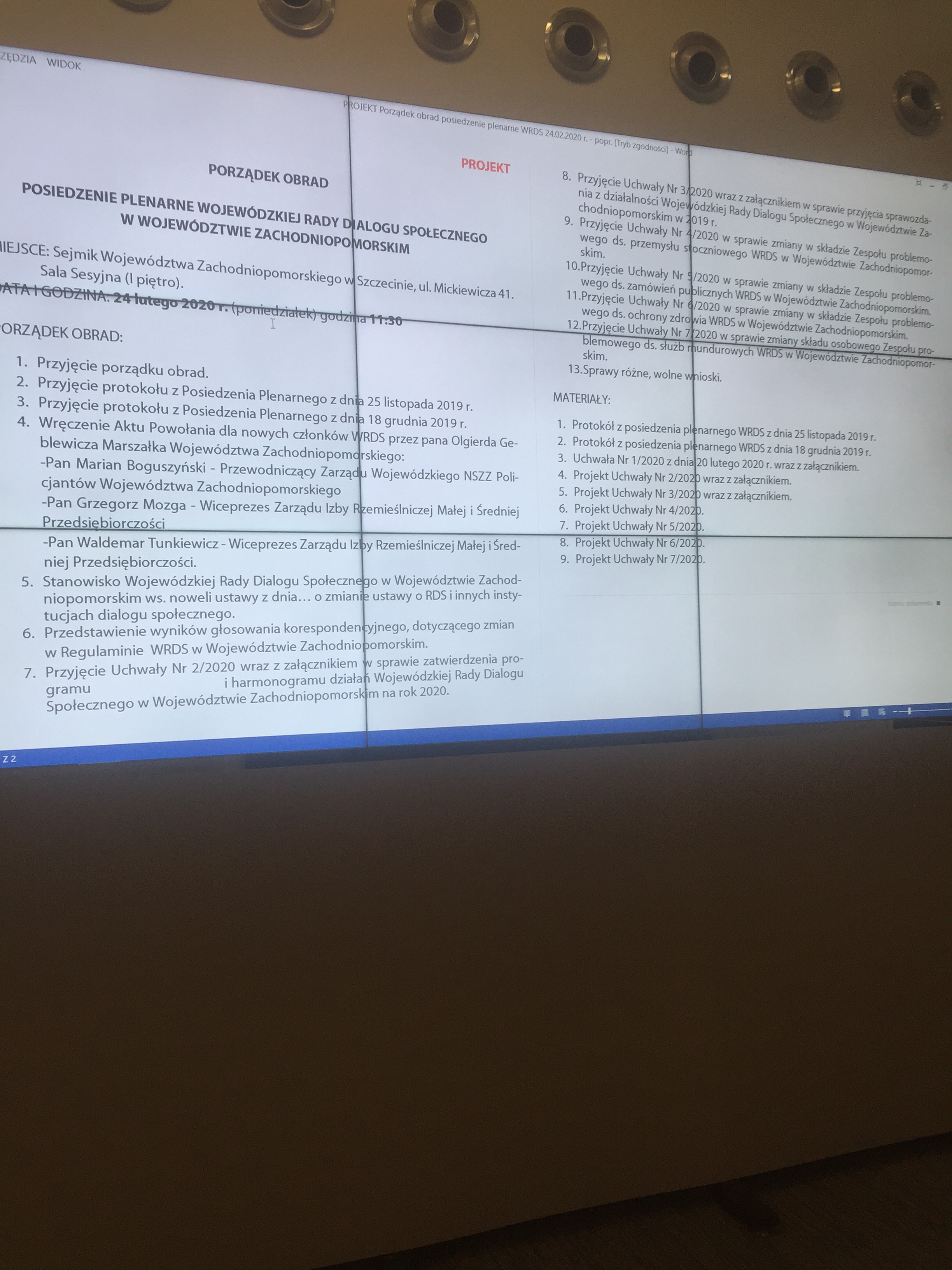 Dnia 24 lutego 2020 r. w Sali Sesyjnej Sejmiku Województwa Zachodniopomorskiego  w Szczecinie odbyło się pierwsze w tym roku Posiedzenie Plenarne WRDS WZ. Posiedzenie prowadził pan Wojciech Osman - Przewodniczący Zarządu Wojewódzkiego FZZ WZ, Przewodniczący Zarządu Regionu Zachodniopomorskiego NSZZ Solidarność 80, sprawujący od 17 grudnia 2019 roku przewodnictwo Wojewódzkiej Rady Dialogu Społecznego. Motywem przewodnim posiedzenia były kwestie formalne dotyczące m.in. zmiany regulaminu, przyjęcia sprawozdania z działaności Rady w 2019 r. i harmonogramu prac na 2020 r. oraz poszerzenia Zespołów roboczych. Pan Olgierd Geblewicz Marszałek Województwa Zachodniopomorskeigo wręczył akty powołania trzem nowym Członkom WRDS: